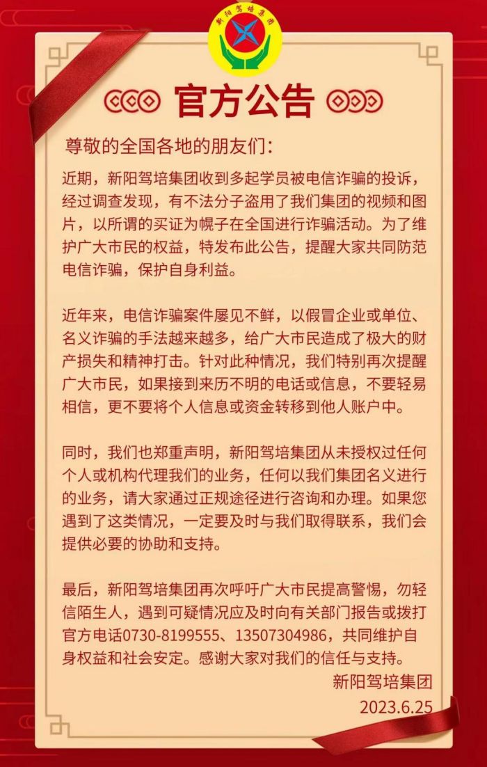 近期,新陽(yáng)駕培集團(tuán)收到多起學(xué)員被電信詐騙的投訴,經(jīng)過(guò)調(diào)查發(fā)現(xiàn),有不法分子盜用了我們集團(tuán)的視頻和圖片,以所謂的買證為幌子在全國(guó)進(jìn)行詐騙活動(dòng)。為了維護(hù)廣大市民的權(quán)益,特發(fā)布此公告,提醒大家共同防范電信詐騙,保護(hù)自身利益。